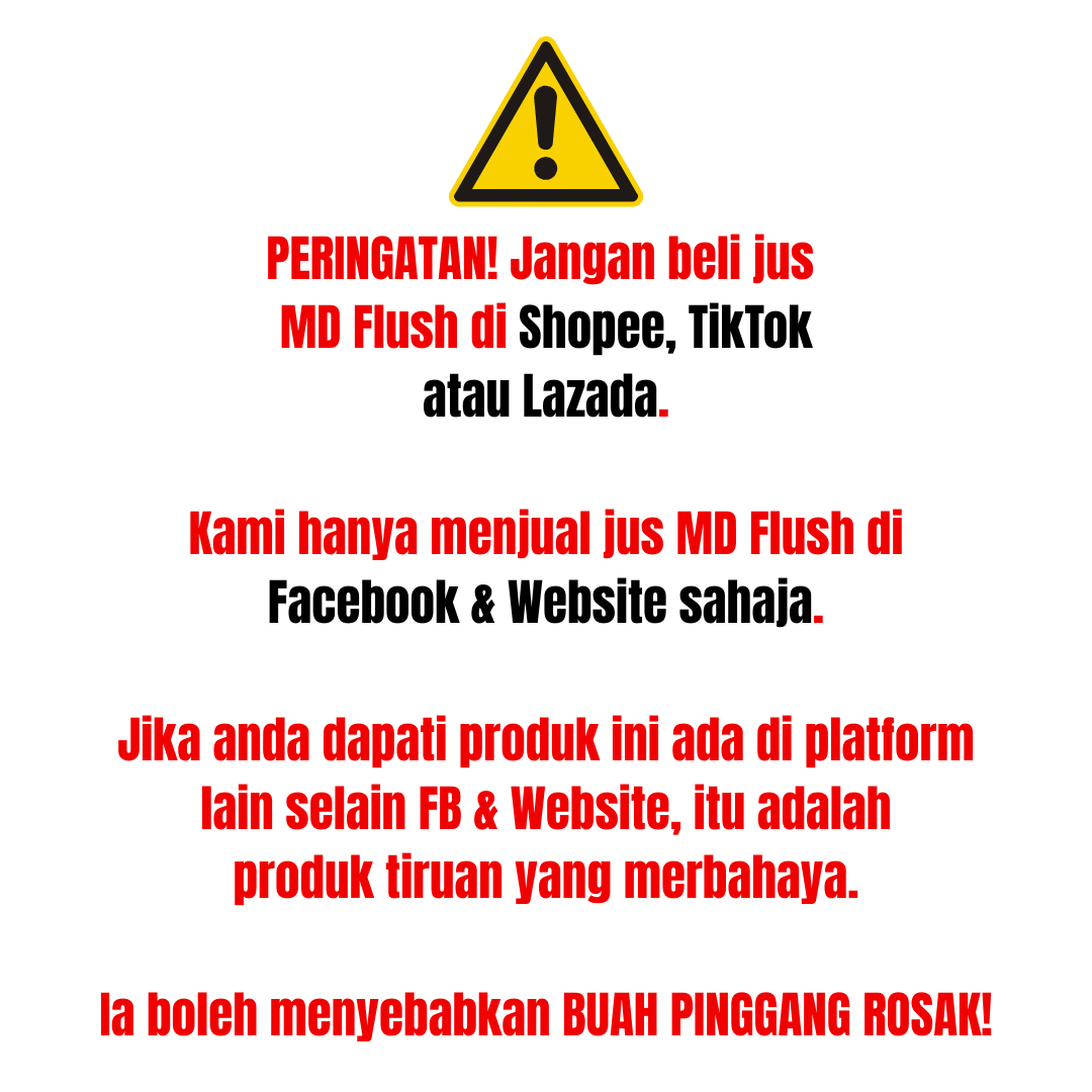 PERINGATAN! Anda dinasihatkan membeli jus MD Flush hanya di platform Facebook dan website sahaja.